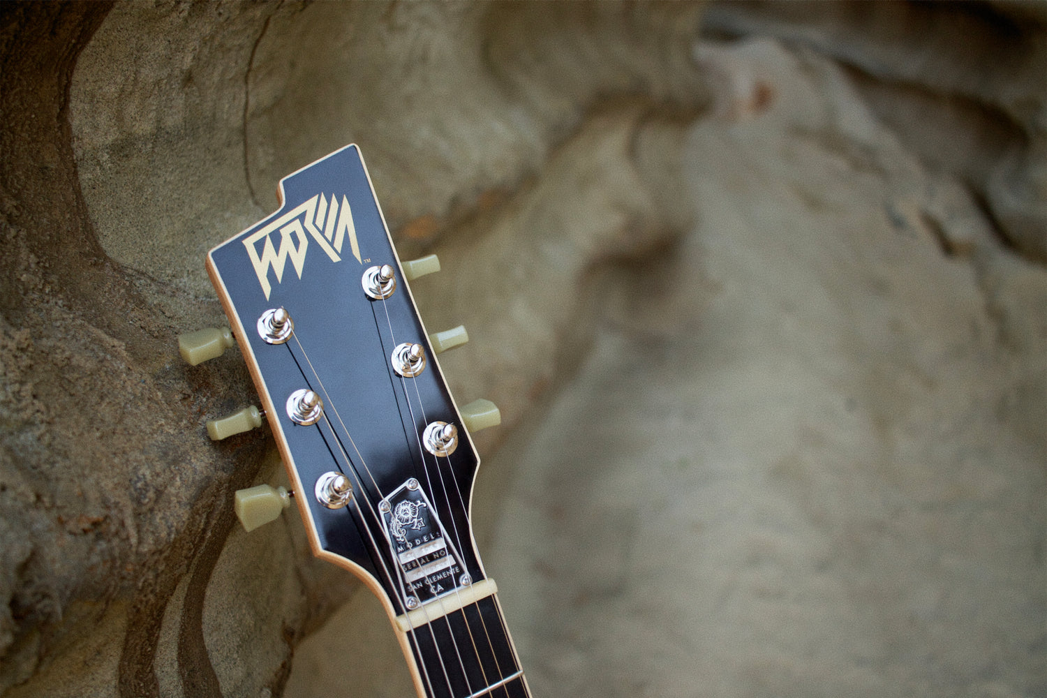 Details throughout include a custom engraved stainless steel neck plate, custom stainless steel string plate, as well as an etched and backfilled stainless steel truss rod cover listing the model name and serial number unique to each instrument.